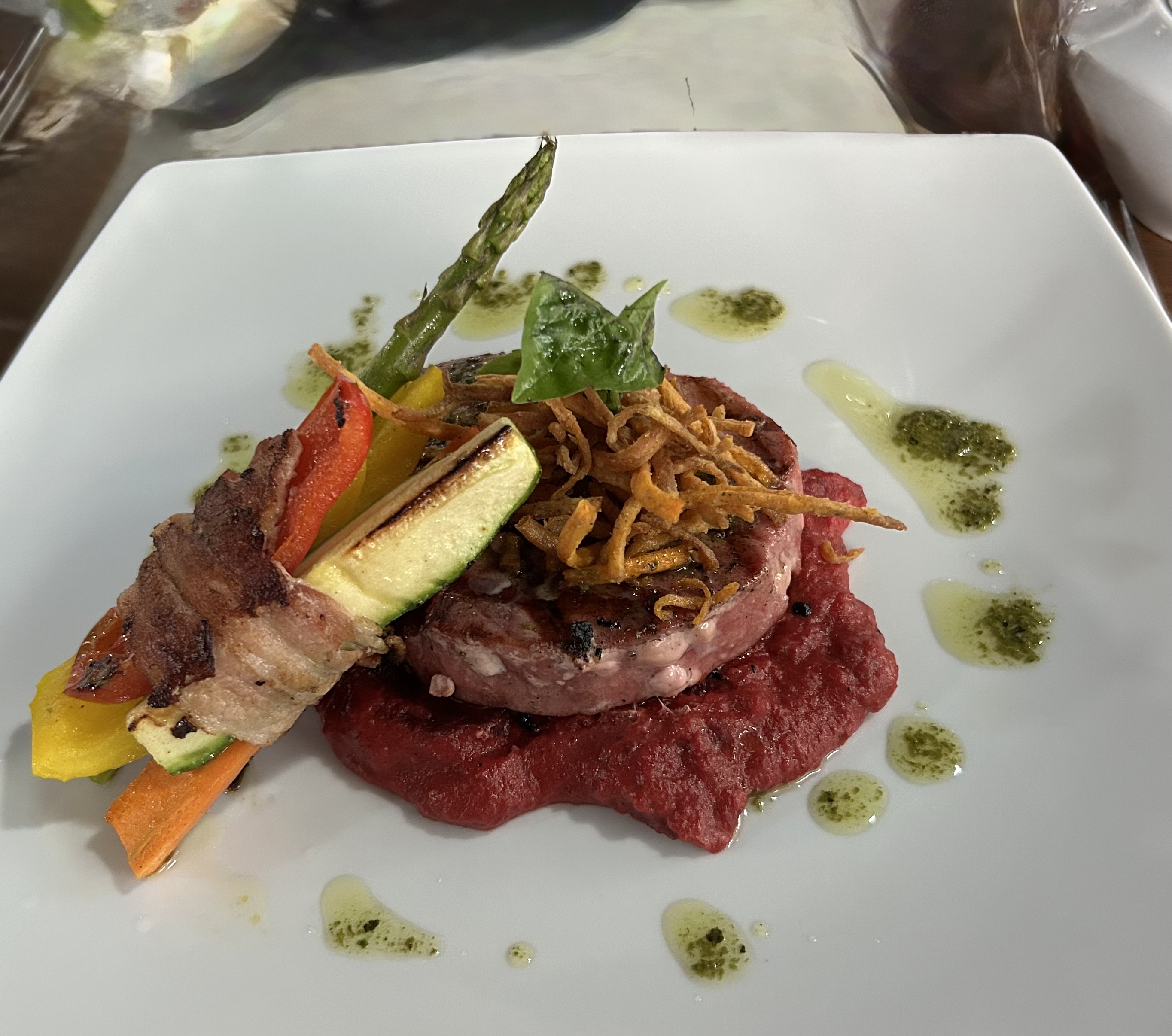 | | | | Tuna Steak on Beet Puree and Pesto with bacon wrapped roasted veggies - OMG! Â